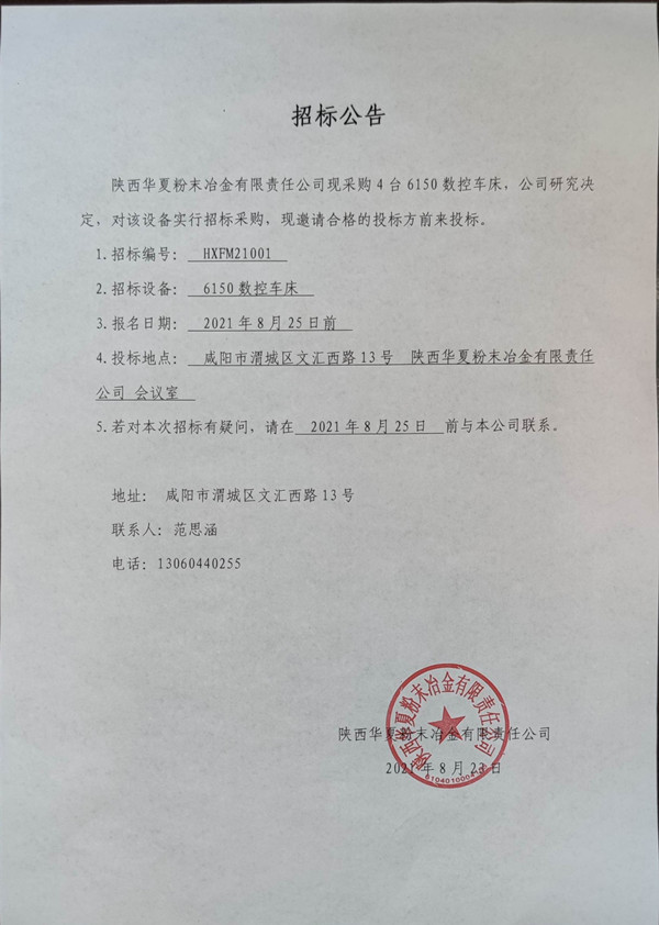 陜西華夏粉末冶金有限責(zé)任公司6150數(shù)控車床招標(biāo)公告