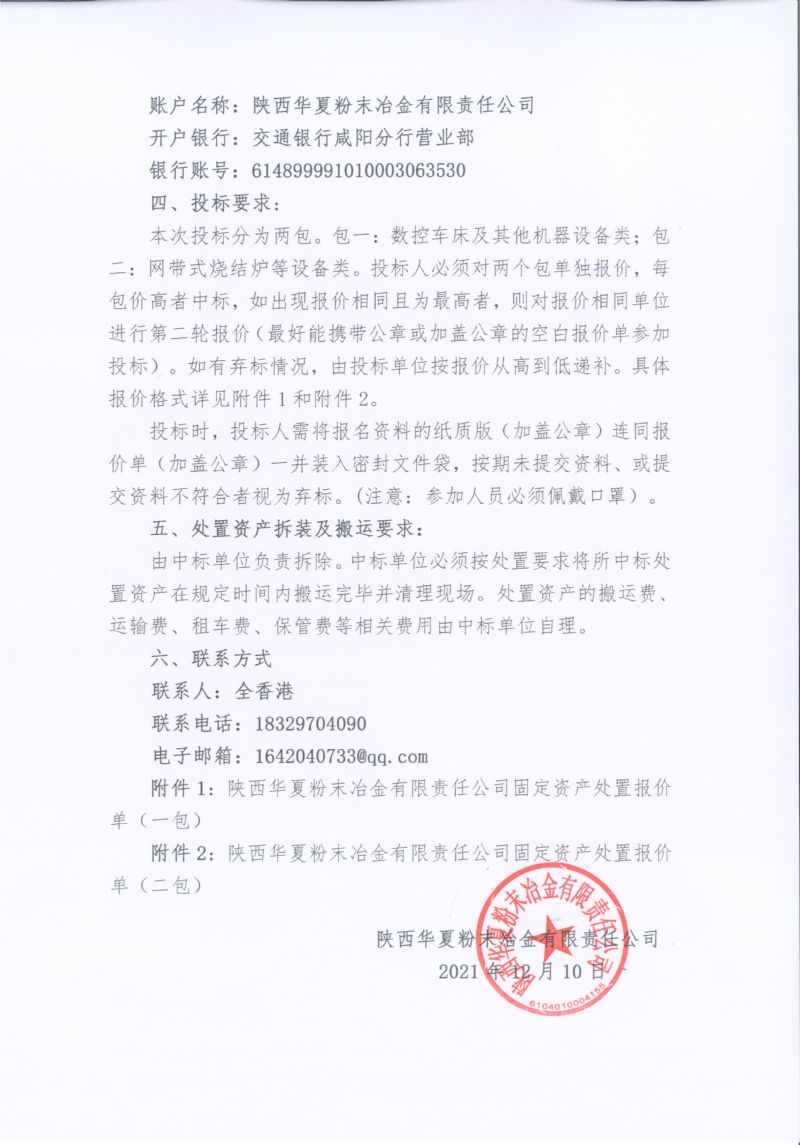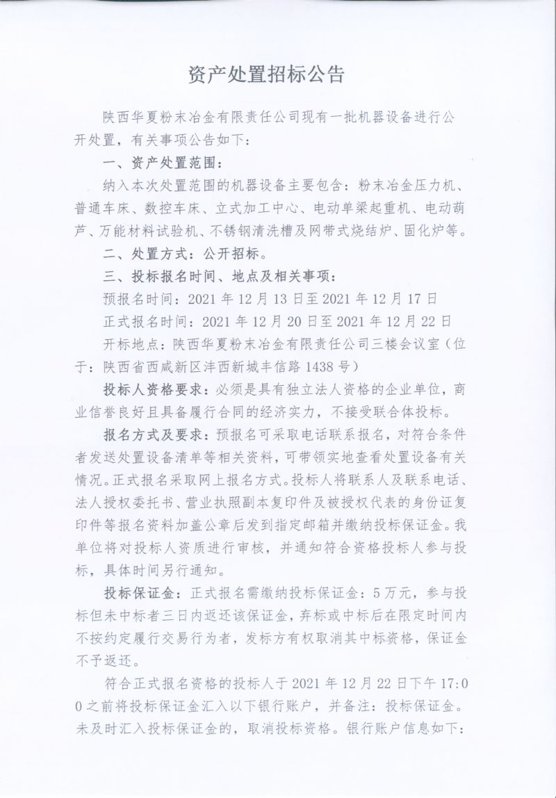 陜西華夏粉末冶金有限責(zé)任公司資產(chǎn)處置招標(biāo)公告