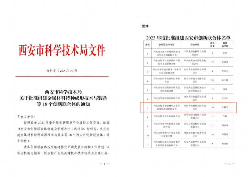 近日,西安市科技局發(fā)布通知,批準西安市各區(qū)(縣)、開發(fā)區(qū)組建18個市級創(chuàng)新聯(lián)合體,我公司牽頭組建的“西安市粉末冶金材料及零件高效制造創(chuàng)新聯(lián)合體”成功入選!
