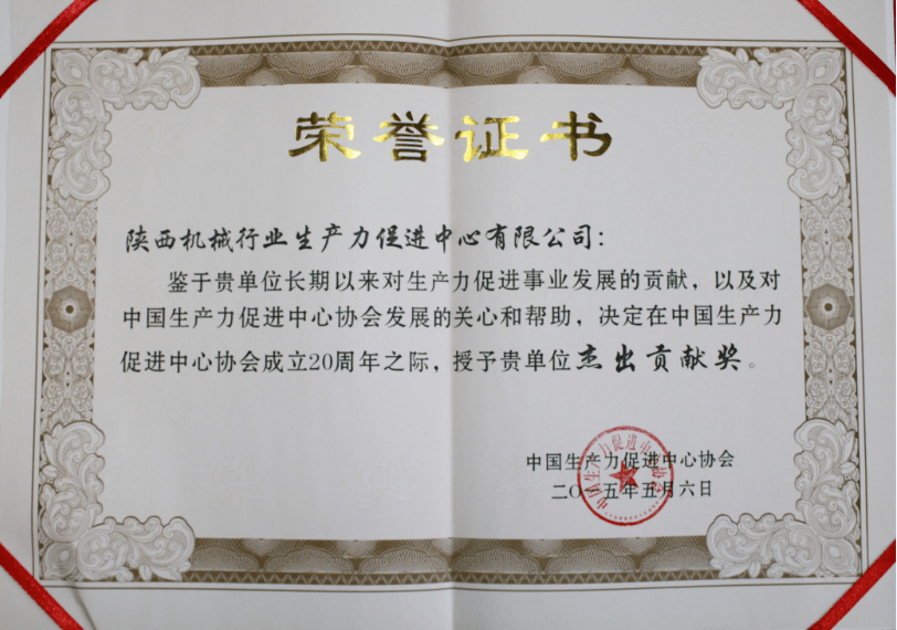 2015年5月7日,中國生產(chǎn)力促進(jìn)中心協(xié)會20周年暨中國生產(chǎn)力創(chuàng)新創(chuàng)業(yè)發(fā)展論壇在北京隆重開幕,陜西機(jī)械行業(yè)生產(chǎn)力促進(jìn)中心(有限公司)榮獲“杰出貢獻(xiàn)獎”先進(jìn)集體光榮稱號。