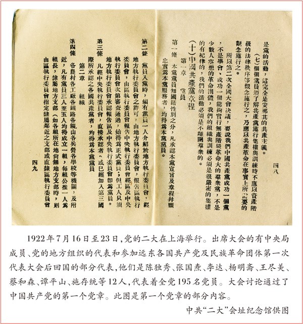 習(xí)近平總書記指出:“學(xué)習(xí)黨章是全體黨員的基本功,這個(gè)功課要經(jīng)常做。學(xué)習(xí)黨章不僅要原原本本學(xué)、反反復(fù)復(fù)學(xué),做到知其然,而且要聯(lián)系實(shí)際學(xué)、深入思考學(xué),做到知其所以然?!秉h章是黨的根本大法,是全面從嚴(yán)治黨的總依據(jù)和總遵循,也是全體黨員言行的總規(guī)矩和總遵循。全黨學(xué)習(xí)貫徹黨章的水平,決定著黨員隊(duì)伍黨性修養(yǎng)的水平,決定著各級(jí)黨組織凝聚力和戰(zhàn)斗力的水平,決定著全面從嚴(yán)治黨的水平。不論是高級(jí)干部還是普通黨員,要做合格黨員,學(xué)習(xí)貫徹黨章都是第一位的要求。 中國共產(chǎn)黨的第一個(gè)黨章是什么時(shí)候產(chǎn)生的呢? 中國共產(chǎn)黨第一次全國代表大會(huì)產(chǎn)生了黨綱,沒有制定黨的正式章程,但一大黨綱已經(jīng)包含屬于黨章性質(zhì)的一些條文,具有了黨章的初步體例。在黨的一大召開一年后,也就是1922年7月16日至23日,中國共產(chǎn)黨第二次全國代表大會(huì)在上海原公共租界南成都路輔德里625號(hào)(今老成都北路7弄30號(hào))舉行。大會(huì)通過的宣言是一份具有重大歷史意義的文件,宣言初步闡明了現(xiàn)階段中國革命的性質(zhì)、對(duì)象、動(dòng)力、策略、任務(wù)和目標(biāo),指明了中國革命的前途。正是在這次大會(huì)上,討論通過了黨的歷史上第一個(gè)黨章——《中國共產(chǎn)黨章程》。 黨的二大通過的黨章采取分章的體例,共六章二十九條,詳細(xì)規(guī)定了黨員條件、入黨手續(xù)、黨的組織系統(tǒng),以及黨的組織原則、紀(jì)律和其他制度。比如,第四章規(guī)定了黨員應(yīng)遵守的政治紀(jì)律和組織紀(jì)律,要求“下級(jí)機(jī)關(guān)須完全執(zhí)行上級(jí)機(jī)關(guān)之命令;不執(zhí)行時(shí),上級(jí)機(jī)關(guān)得取消或改組之”“凡有關(guān)系全國之重大政治問題發(fā)生,中央執(zhí)行委員會(huì)未發(fā)表意見時(shí),區(qū)或地方執(zhí)行委員會(huì),均不得單獨(dú)發(fā)表意見,區(qū)或地方執(zhí)行委員會(huì)所發(fā)表之一切言論倘與本黨宣言、章程及中央執(zhí)行委員會(huì)之議決案及所定政策有抵觸時(shí),中央執(zhí)行委員會(huì)得令其改組之”“本黨一切會(huì)議均取決多數(shù),少數(shù)絕對(duì)服從多數(shù)”等。另外,第四章第二十五條還提出了6種開除出黨的情形——“言論行動(dòng)有違背本黨宣言、章程及大會(huì)、各執(zhí)行委員會(huì)之議決案”“無故連續(xù)二次不到會(huì)”“欠繳黨費(fèi)三個(gè)月”“無故連續(xù)四個(gè)星期不為本黨服務(wù)”“經(jīng)中央執(zhí)行委員會(huì)命令其停止出席留黨察看期滿而不改悟”“泄漏本黨秘密”。 中國共產(chǎn)黨第一個(gè)黨章的產(chǎn)生,對(duì)于把黨建設(shè)成為一個(gè)政治上、思想上和組織上集中統(tǒng)一的無產(chǎn)階級(jí)政黨,具有重要意義。 黨的二大通過的黨章能夠完整保存下來,還有一段非常感人的故事。故事的主人公叫張靜泉,又名張人亞,是上海最早的工人出身的黨員之一。黨的二大結(jié)束后,中央領(lǐng)導(dǎo)機(jī)構(gòu)按照規(guī)定,將大會(huì)通過的章程和其他決議案送給莫斯科的共產(chǎn)國際,還鉛印了小冊子,分發(fā)給黨內(nèi)有關(guān)人員學(xué)習(xí)貫徹,作為早期黨員的張靜泉得到了一本。