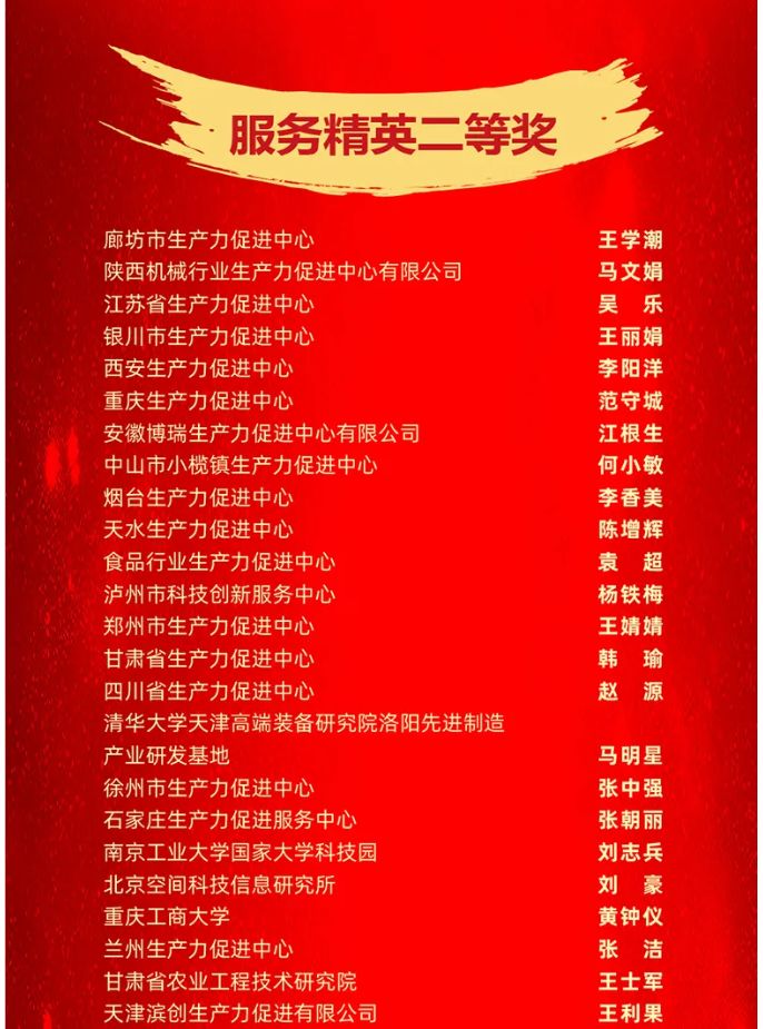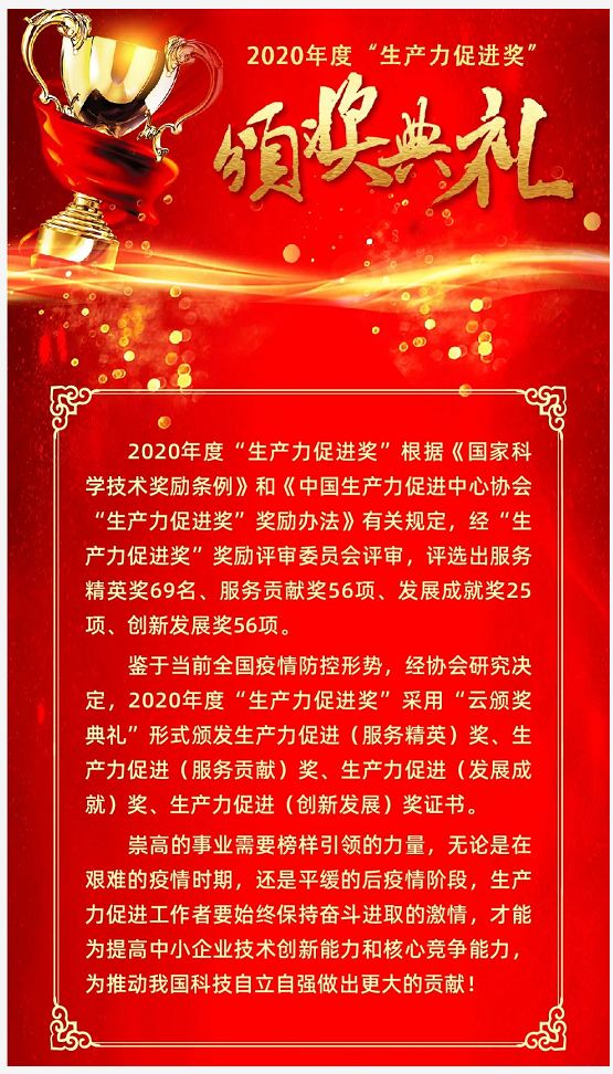 2021年11月26日,中國生產(chǎn)力促進(jìn)中心協(xié)會舉辦2020年度“生產(chǎn)力促進(jìn)獎”云頒獎典禮。經(jīng)各地、各相關(guān)部門逐級推薦,“生產(chǎn)力促進(jìn)獎”獎勵辦公室形式審査,“生產(chǎn)力促進(jìn)獎”獎勵評審委員會評審,評選出服務(wù)精英獎69名進(jìn)行獎勵。我院生產(chǎn)力促進(jìn)中心有限公司馬文娟同志榮獲“中國生產(chǎn)力促進(jìn)中心2020年度‘生產(chǎn)力促進(jìn)獎’”(服務(wù)精英獎)二等獎。